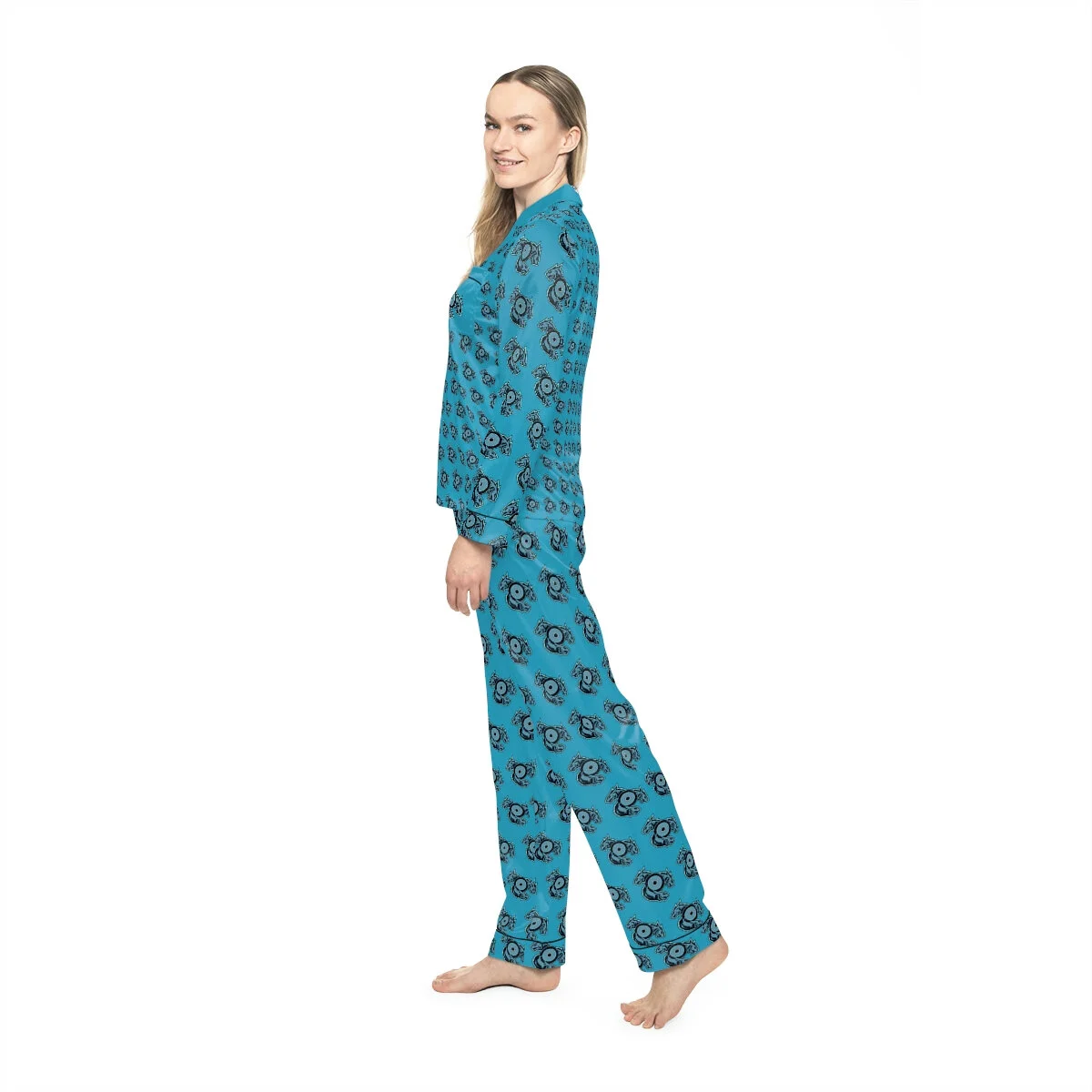 These personalized pajamas for women feel divinely soft to the touch thanks to their 95% polyester and 5% spandex blend. Now, you can add a custom design all over the soft, satin fabric and create unique pajama sets. Each set comes with a notch lapel (collar style) and a drawstring waits for a comfy, snug fit.